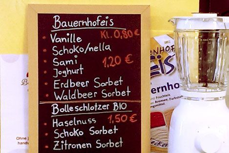 Nicht nur Kinder lieben Eis, auch Erwachsene sind unseren kühlen Köstlichkeiten nicht abgeneigt. Unser Eis beziehen wir vom Ruhbauernhof im Schwarzwald und von Bolleschlotzer. Häufig wird nach den Eissorten Schokonella, Waldfrucht, Joghurt, Pistazie, Nuss, Himbeere und Sami gefragt.